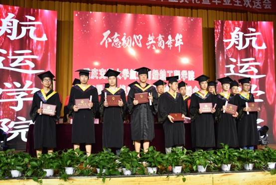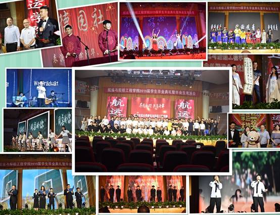 第二阶段:随着授位仪式的结束,毕业晚会也拉开了帷幕。相声《送别》向学长学姐们发出了美好的祝福,辅导员韩应彬老师用书法《诗和远方》表达了对莘莘学子的不舍之情,歌曲《平凡之路》寄托了即将毕业的学长学姐们对老员工活和寝室友情的留恋,小品《开盖有奖》更是精彩,逗笑了台下无数的观众,辅导员老师和专业老师用一支舞蹈《同桌的你》表达了对全体毕业生们的祝福。双福的10名帅气的学弟带来的军体拳表演,更是将整个晚会的气氛推到了高潮,毕业生朗诵《致毕业生的一封信》则是让全场毕业生潸然泪下,16级航海技术的两名同学更是用优美的舞姿吸引了全场每一个人的眼球,表达了对学长学姐的衷心祝福,最后,在一曲《讲不出再见》的歌声中,本次晚会圆满结束。