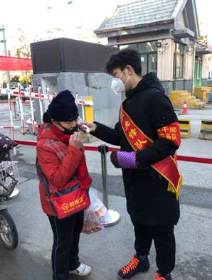 闫旭,山东济南,航海技术专业1802班员工。自愿报名社区志愿服务队,自2月16日至24日志愿在卡口为出入居民测量体温,进行信息登记。