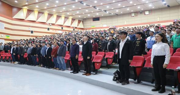 全体师生齐唱国歌,歌声嘹亮,回荡于报告厅。典礼正式开始。