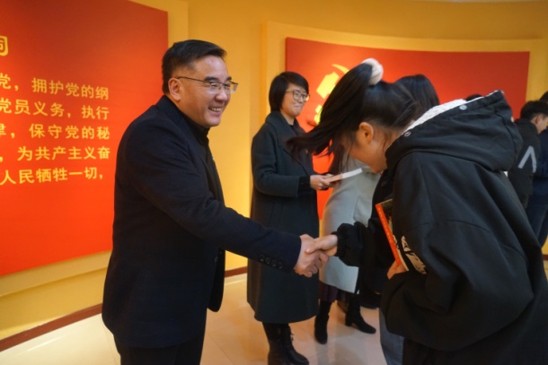 随后,刘君书记与参加仪式的老师一起,为新党员佩戴党徽,分发《党章》,并赠送《习近平与老员工朋友们》一书,激励新党员们要牢记初心使命,树立廉政意识,凝聚奋进力量,在全心全意为人民服务之中实现自我价值。