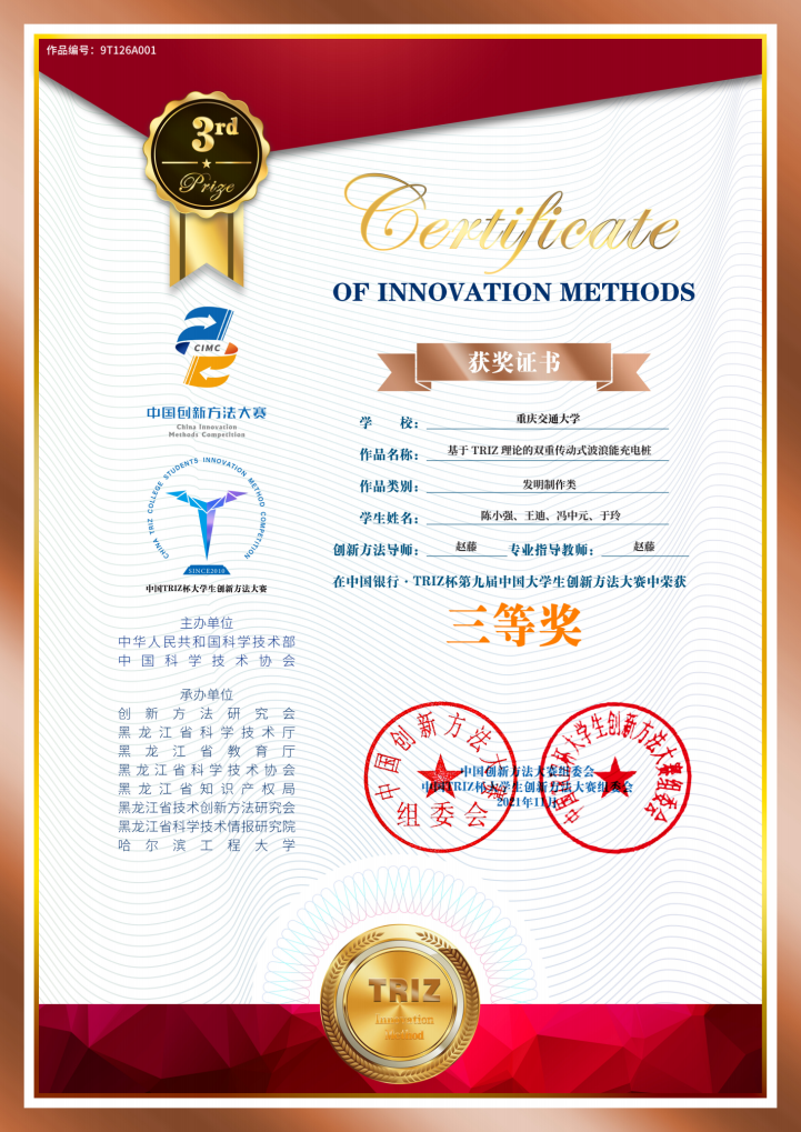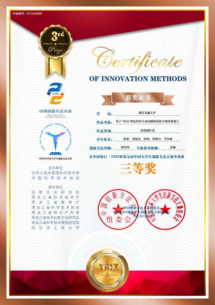由于疫情影响,赛制发生了较大变化,公司高度重视本次比赛,在第三届重庆市创新方法获奖作品中优选16项作品推荐参加国赛,选派优秀指导教师对参赛队员进行集中培训、重点答疑,从选题到解题再到实物制作进行全程跟踪指导。经过激烈角逐,最终公司赵藤、赵珂、邱珍锋老师指导的《基于TRIZ理论的双重传动式波浪能充电桩》、《基于TRIZ理论的隧道照明智能控制系统》、《基于TRIZ理论的仿生波动鳍推进的全地形机器人》3项作品分别获得三等奖。