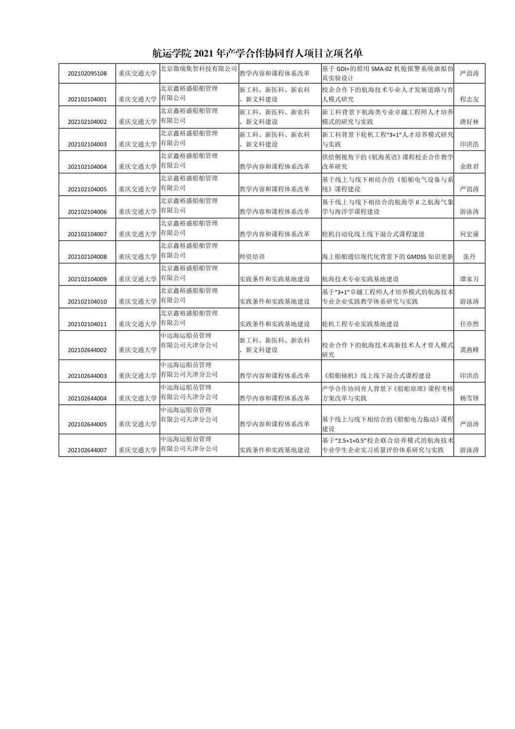 2021年,公司在北京鑫裕盛船舶管理有限公司、中远海运船员管理有限公司天津分公司和北京微瑞集智科技有限公司的大力支持下,通过教育部产学协同育人平台,实现了立项项目的大幅度增长,项目数量在全校位居第一,占全校的项目总数(48项)的三分之一强。