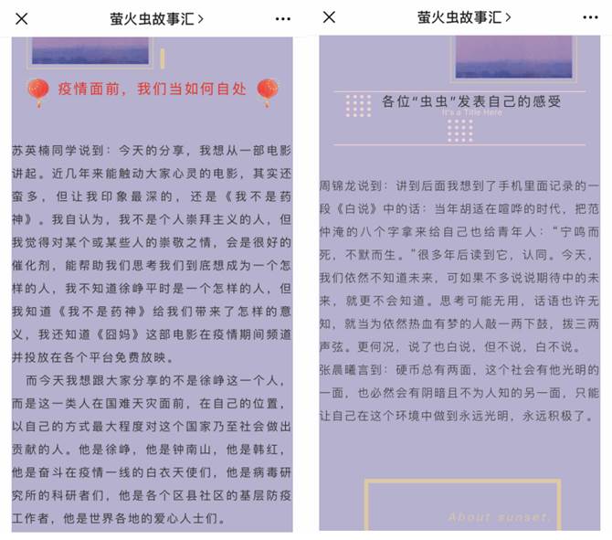 居家隔离生活,让很多员工产生焦虑、恐慌情绪。长期宅家生活,员工们生活缺少重心,迫切想回公司上课。“萤火虫故事汇”让大家抱团,吐槽、交流、交友、学习,让不同年级不同专业的学子们在一起碰撞。足不出户,我们能听好故事;宅在家里,我们一样传递正能量。