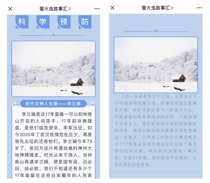 “萤火虫故事汇”线上沙龙,由支部书记吴燕老师主持筹办,活动通过QQ群线上语音形式进行,虫友们在线上准时守候倾听,听完故事之后大家可在群里自由交流,发表自己的心得和感触。后期将故事推送到《萤火虫故事汇》微信公众号上与更多人分享。活动中,支部党员率先垂范,入党积极分子、优秀团员踊跃参与。每个故事讲述人都精心准备故事内容,主题鲜明,结合时代旋律,“最美奋斗者”黄文秀、“抗疫”巾帼李兰娟、“生命的卫士”钟南山、默默无闻的志愿者、“曼巴精神”科比等等,让我们隔着屏幕也能感受到坚定的理想信念和奋斗不息的脚步。