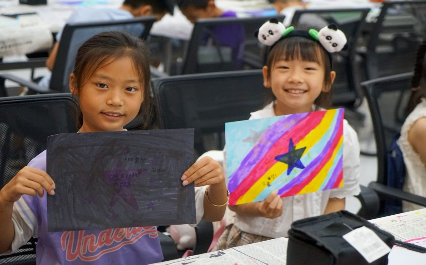 在“白日梦想家”课堂上,实践团成员们化身为星际导航员,带领孩子们踏上一场探索内心宇宙的奇幻之旅。他们鼓励孩子们用画笔捕捉心中那片神秘的星河,无论是黑色的深邃,还是五彩斑斓的绚丽,都值得被珍视和追求。“梦想星空图”不仅是一张张纸上的涂鸦,它是孩子们内心世界的直观呈现,是对未来的向往与自我认知的初步探索。在每一幅“星空图”中,孩子们自由地写下梦想,在这片属于自己的宇宙中快乐航行。