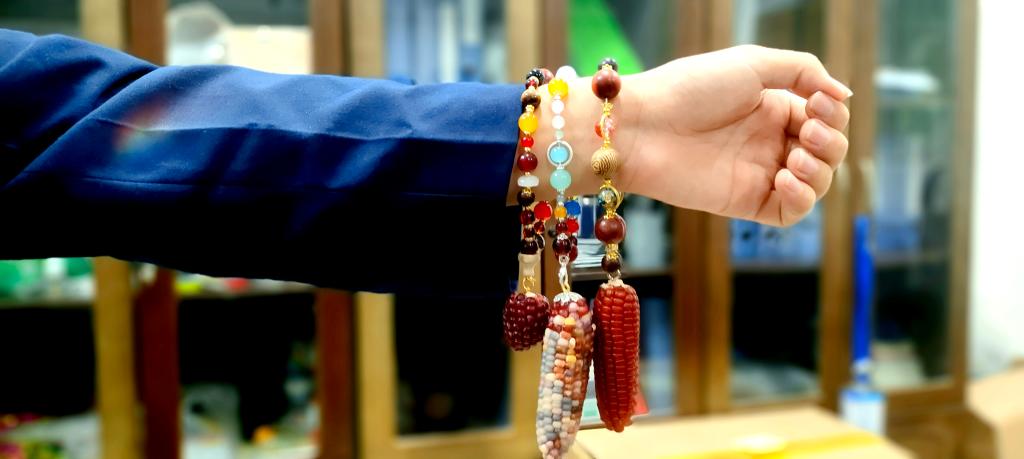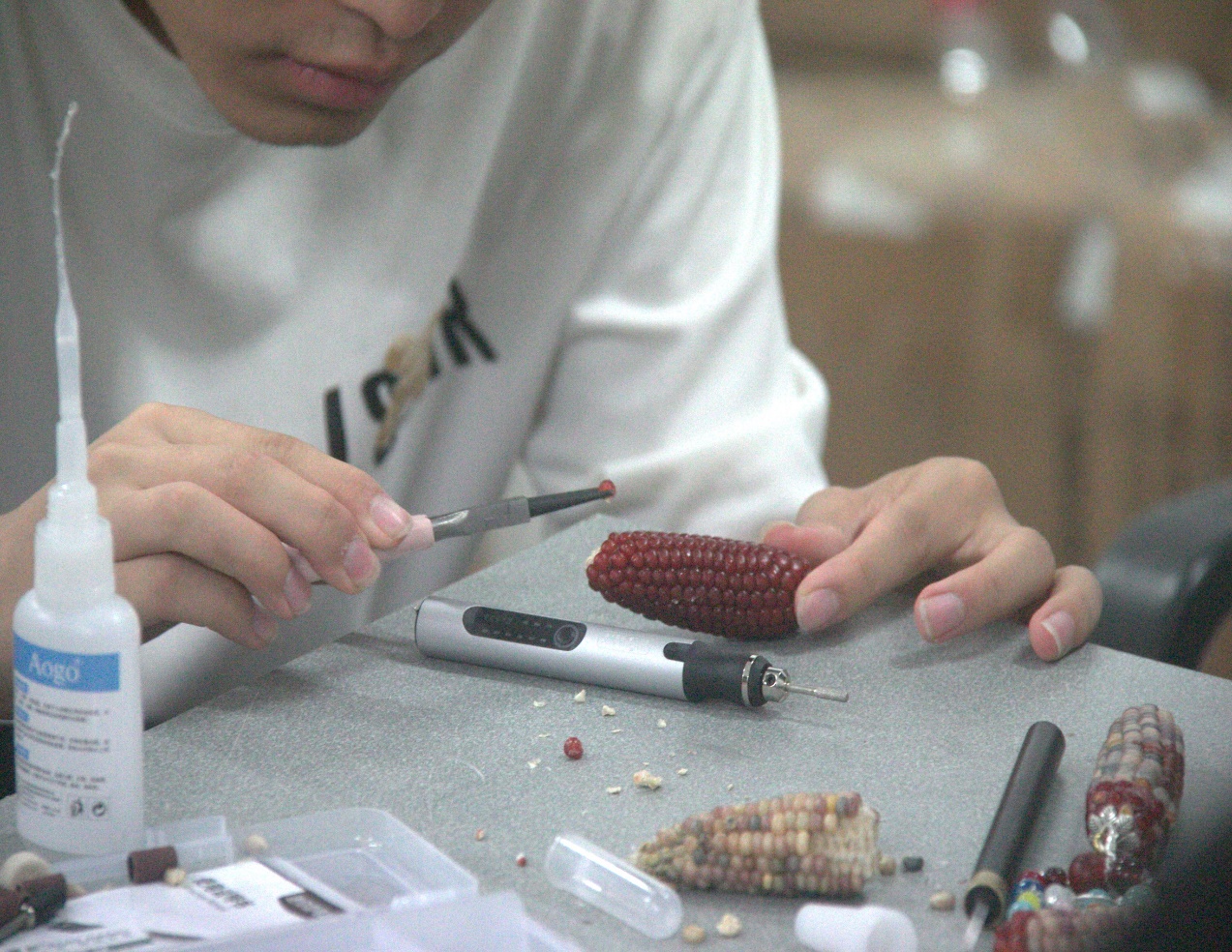 在实际操作过程中,员工们充分发挥了各自的创意与想象力。他们根据玉米的不同形态、色泽和纹理来设计和制作作品。有的员工通过对玉米进行简单的打磨和抛光来展现其天然之美;而有的员工则使用雕刻工具在玉米表面刻制复杂的图案,并通过钻孔、串线、装饰等工艺,使每件作品都独具特色。经过几小时的努力,一件件精美的文玩玉米成品在员工们手中诞生。