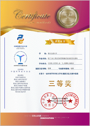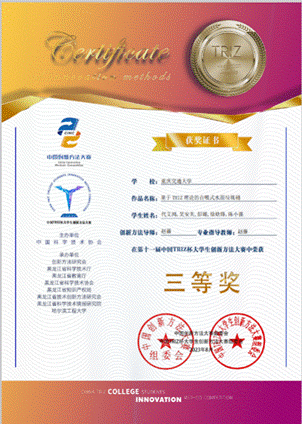 公司在第五届重庆市创新方法大赛的基础上优选5项作品推荐参加国赛,经过激烈角逐,3项作品进入答辩环节,最终公司赵藤老师指导的《基于TRIZ理论的自吸式水面垃圾桶》《基于TRIZ理论的污损生物清理装置》《基于TRIZ理论的新型机械式波浪能发电系统》3项作品分别获得三等奖的优异成绩。