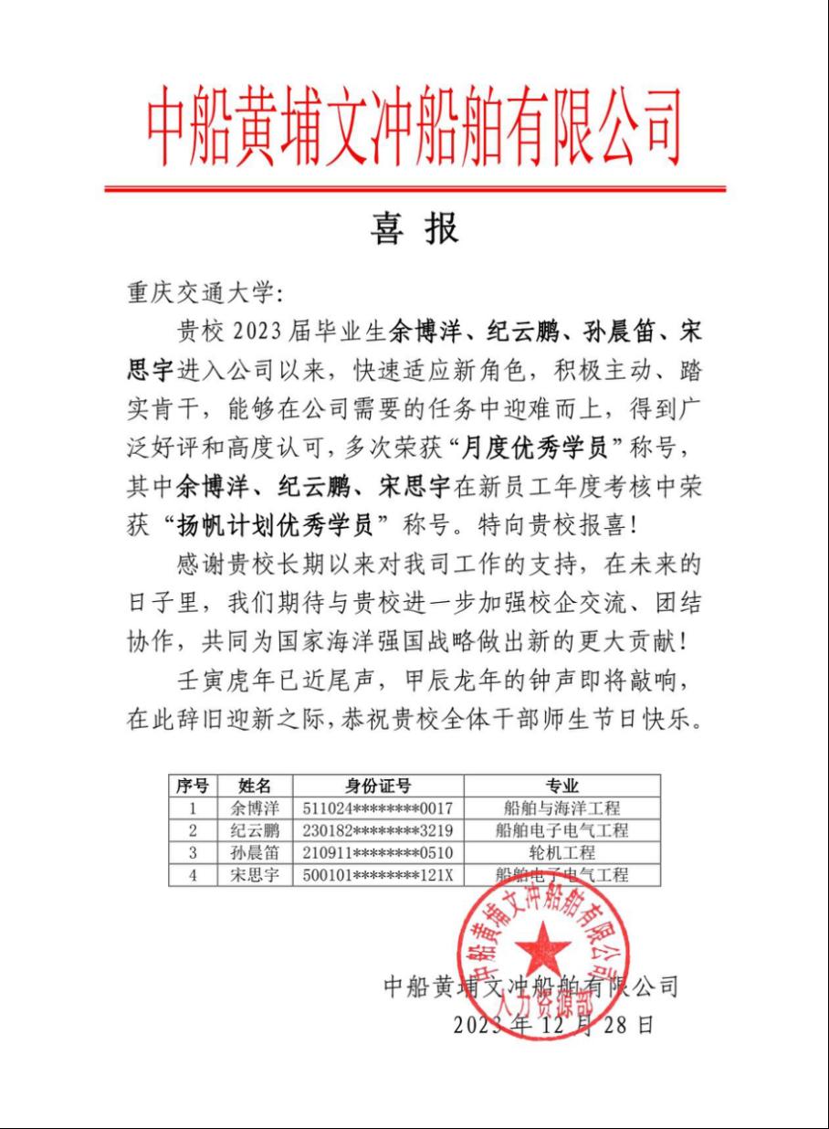 近日,中国船舶集团有限公司下属黄埔文冲船舶有限公司(以下简称中船黄埔)向公司发来喜报。伟德国际bevictor19462023级毕业生余博洋、纪云鹏、孙晨笛、宋思宇四名同学,进入公司后,快速适应新角色,积极主动、踏实肯干,在公司各项艰巨任务中迎难而上,得到广泛好评和高度认可,多次荣获“月度优秀学员”称号,其中余博洋、纪云鹏、宋思宇在新员工年度考核中荣获公司“扬帆计划优秀学员”称号。