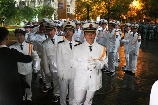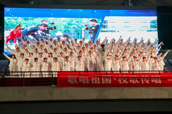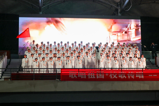 在黑夜里,摇曳的五星红旗仿佛是那璀璨的明星,悠扬激情的旋律仿佛将人带入了那段峥嵘的岁月,感悟着先辈们的艰苦卓绝,也唱响了对祖国的祝福与热爱。