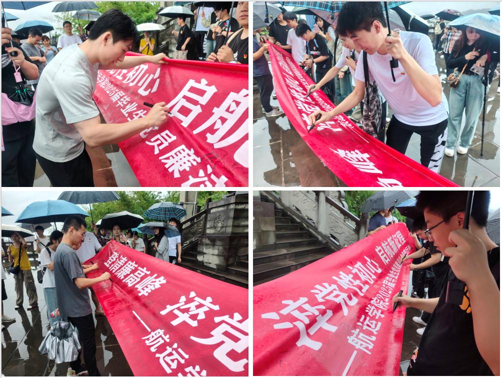 活动尾声,毕业生党员们在“登清廉高峰 淬党性初心 启航新征程”横幅上,郑重签下自己的姓名,许下“行稳致远、清风护航”的青春誓言。